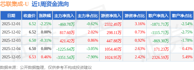 资金流向数据方面,本周芯联集成主力资金合计净流出3798.93万元,游资资金合计净流入5157.84万元,散户资金合计净流出1358.91万元。本周资金流向一览见下表: