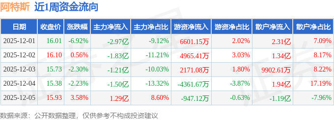 资金流向数据方面,本周阿特斯主力资金合计净流出6.23亿元,游资资金合计净流入8428.85万元,散户资金合计净流入5.39亿元。本周资金流向一览见下表: