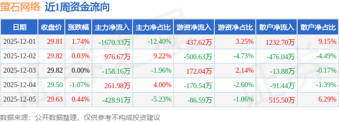 资金流向数据方面,本周萤石网络主力资金合计净流出1018.74万元,游资资金合计净流出148.1万元,散户资金合计净流入1166.84万元。本周资金流向一览见下表: