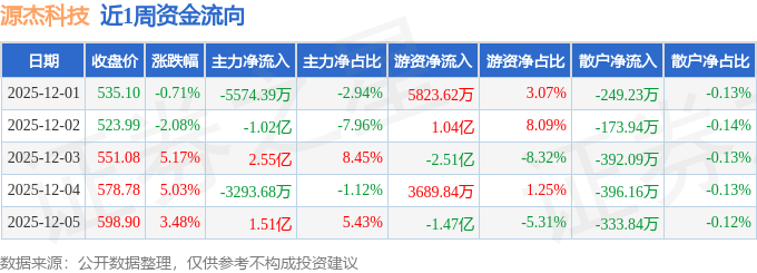 资金流向数据方面,本周源杰科技主力资金合计净流入2.15亿元,游资资金合计净流出1.99亿元,散户资金合计净流出1545.25万元。本周资金流向一览见下表: