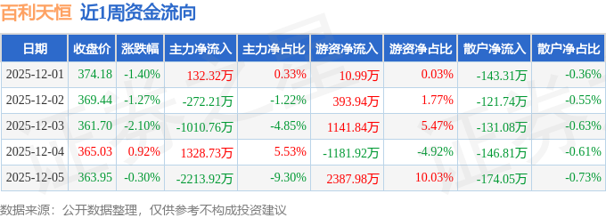 资金流向数据方面,本周百利天恒主力资金合计净流出2035.84万元,游资资金合计净流入2752.83万元,散户资金合计净流出716.99万元。本周资金流向一览见下表: