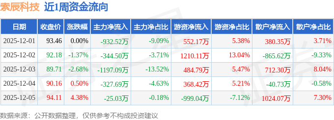 资金流向数据方面,本周索辰科技主力资金合计净流出2826.82万元,游资资金合计净流入1616.44万元,散户资金合计净流入1210.38万元。本周资金流向一览见下表: