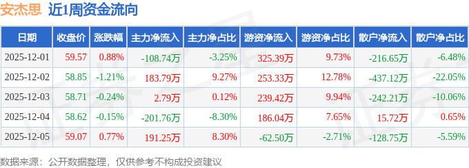 资金流向数据方面,本周安杰思主力资金合计净流入67.32万元,游资资金合计净流入941.68万元,散户资金合计净流出1009.0万元。本周资金流向一览见下表: