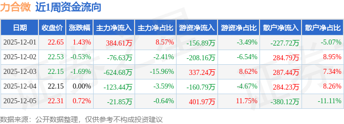 资金流向数据方面,本周力合微主力资金合计净流出461.99万元,游资资金合计净流入213.38万元,散户资金合计净流入248.61万元。本周资金流向一览见下表: