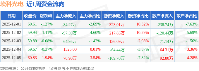 资金流向数据方面,本周埃科光电主力资金合计净流出169.58万元,游资资金合计净流入442.78万元,散户资金合计净流出273.21万元。本周资金流向一览见下表: