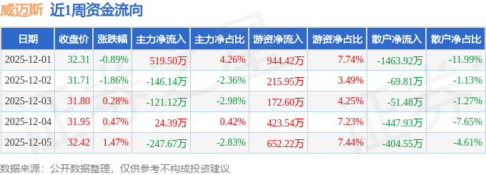 资金流向数据方面,本周威迈斯主力资金合计净流入28.96万元,游资资金合计净流入2408.73万元,散户资金合计净流出2437.69万元。本周资金流向一览见下表: