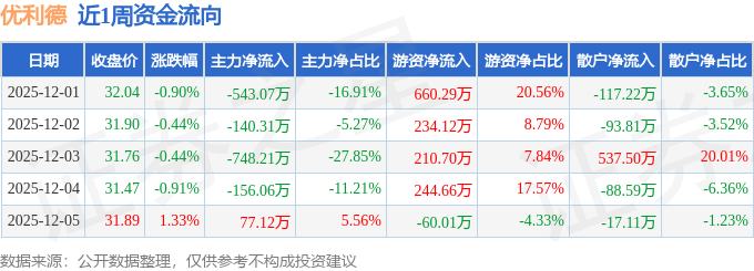 资金流向数据方面,本周优利德主力资金合计净流出1510.53万元,游资资金合计净流入1289.76万元,散户资金合计净流入220.77万元。本周资金流向一览见下表: