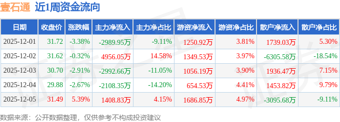 资金流向数据方面,本周壹石通主力资金合计净流出1726.08万元,游资资金合计净流入5998.03万元,散户资金合计净流出4271.94万元。本周资金流向一览见下表: