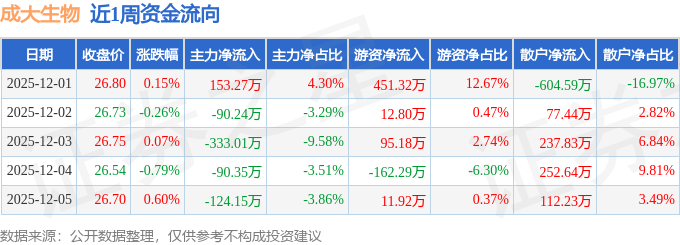 资金流向数据方面,本周成大生物主力资金合计净流出484.48万元,游资资金合计净流入408.92万元,散户资金合计净流入75.56万元。本周资金流向一览见下表: