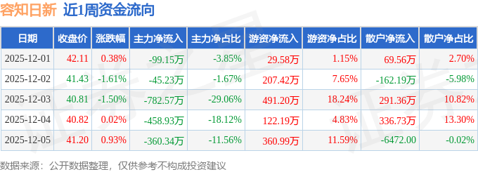 资金流向数据方面,本周容知日新主力资金合计净流出1746.21万元,游资资金合计净流入1211.39万元,散户资金合计净流入534.82万元。本周资金流向一览见下表:
