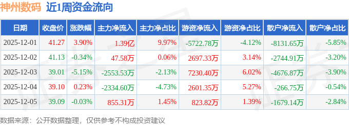 资金流向数据方面,本周神州数码主力资金合计净流入9869.2万元,游资资金合计净流入7630.12万元,散户资金合计净流出1.75亿元。本周资金流向一览见下表: