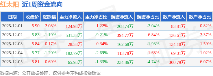 资金流向数据方面,本周红太阳主力资金合计净流出626.6万元,游资资金合计净流出97.72万元,散户资金合计净流入724.32万元。本周资金流向一览见下表: