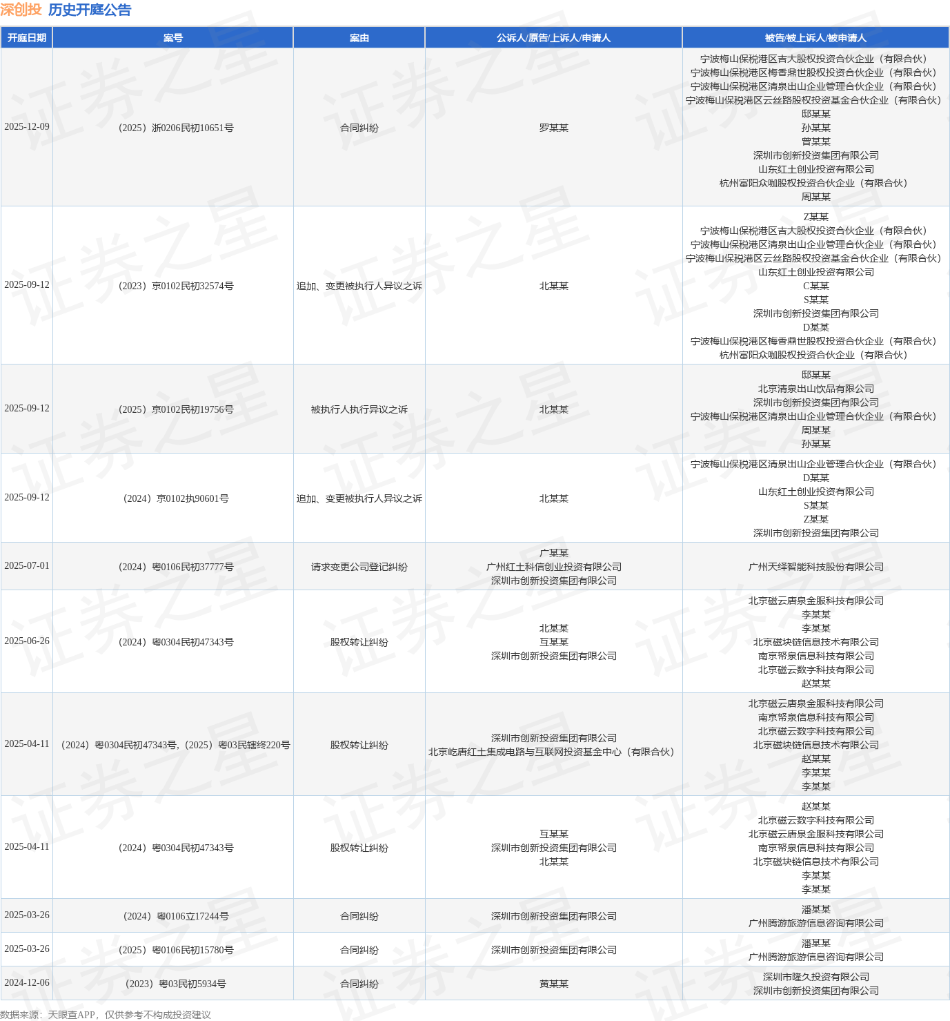 案号:(2025)浙0206民初10651号根据统计,近一年内以深圳市创新投资集团有限公司为当事人的历史开庭公告有11则,其中案由为“合同纠纷”的公告以4则居首,其次为“股权转让纠纷”有3则,“追加、变更被执行人异议之诉”有2则。历史开庭公告如下: