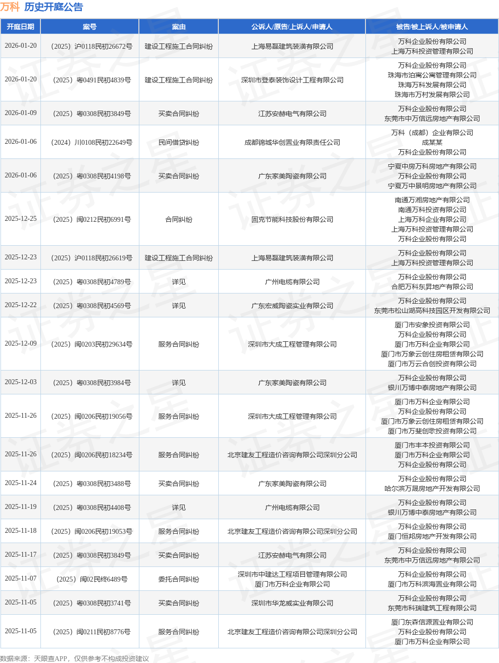 案号:(2025)闽0203民初29634号根据统计,近一年内以万科企业股份有限公司为当事人的历史开庭公告有338则,其中案由为“买卖合同纠纷”的公告以218则居首,其次为“服务合同纠纷”有20则,“建设工程施工合同纠纷”有19则。历史开庭公告(前20条)如下: