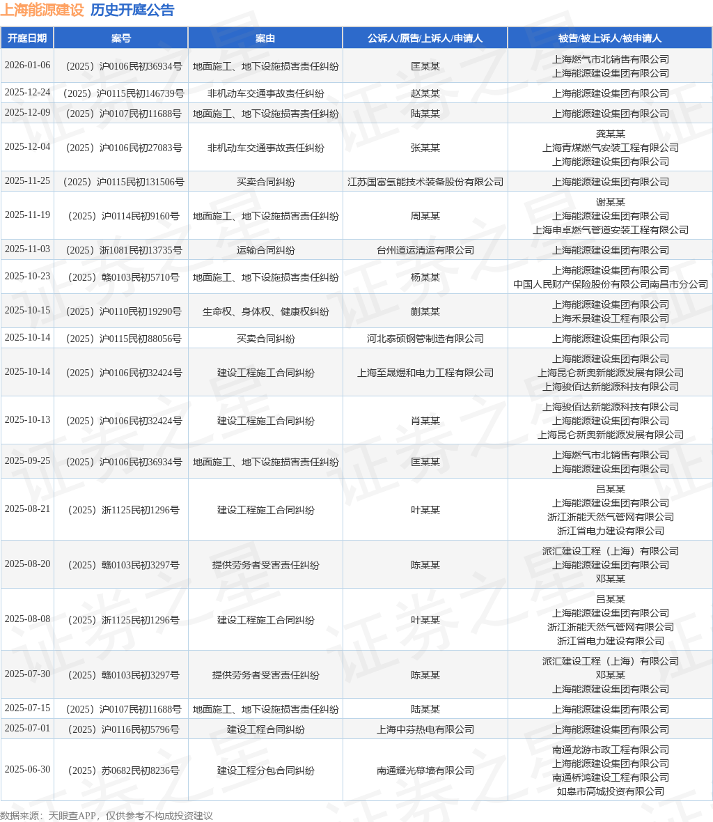 案号:(2025)沪0107民初11688号根据统计,近一年内以上海能源建设集团有限公司为当事人的历史开庭公告有43则,其中案由为“建设工程施工合同纠纷”的公告以9则居首,其次为“地面施工、地下设施损害责任纠纷”有7则,“买卖合同纠纷”有6则。历史开庭公告(前20条)如下: