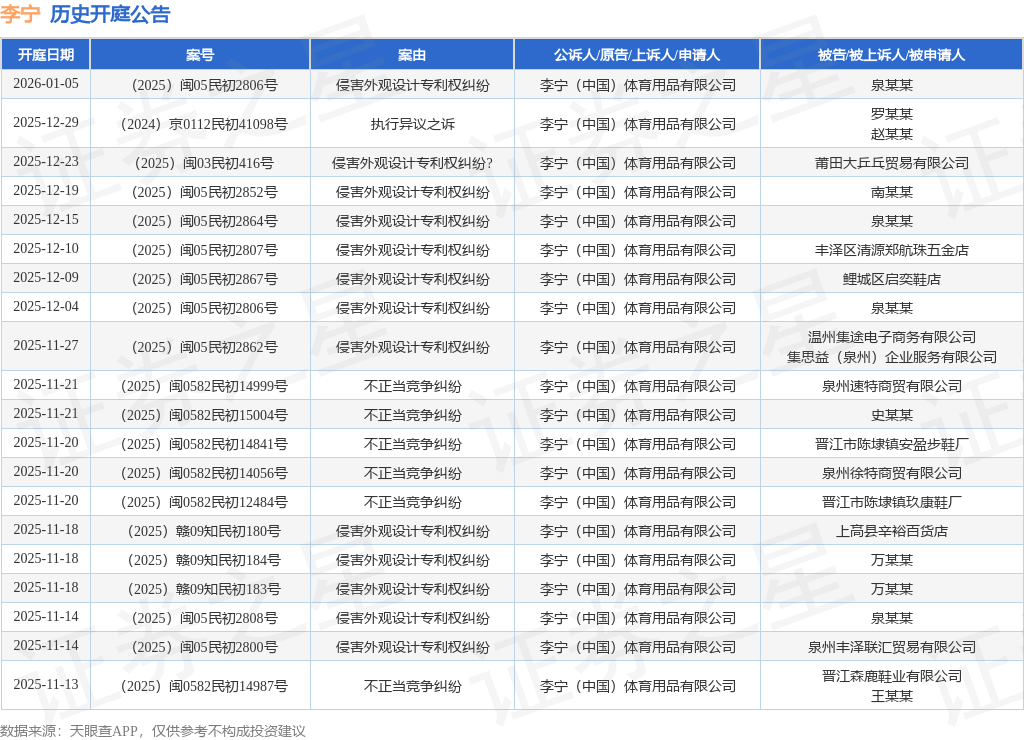 案号:(2025)闽05民初2867号根据统计,近一年内以李宁(中国)体育用品有限公司为当事人的历史开庭公告有69则,其中案由为“不正当竞争纠纷”的公告以45则居首,其次为“侵害外观设计专利权纠纷”有12则,“侵害商标权纠纷”有5则。历史开庭公告(前20条)如下: