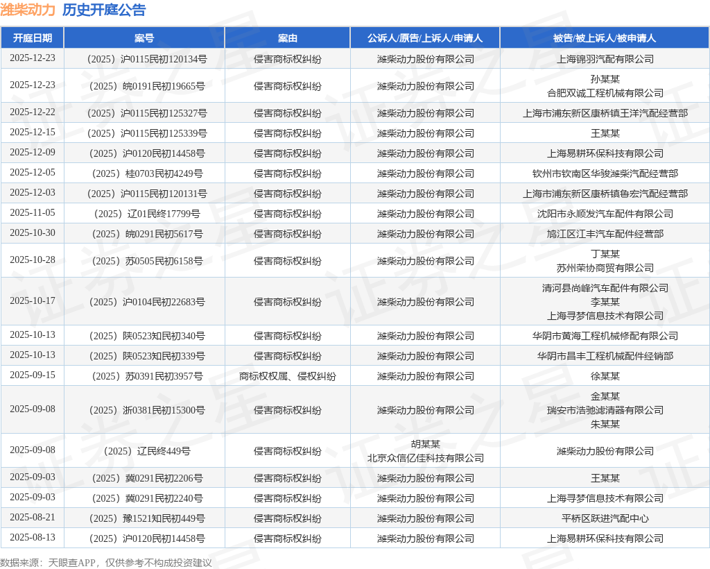 案号:(2025)沪0120民初14458号根据统计,近一年内以潍柴动力股份有限公司为当事人的历史开庭公告有79则,其中案由为“侵害商标权纠纷”的公告以57则居首,其次为“买卖合同纠纷”有10则,“商标权权属、侵权纠纷”有6则。历史开庭公告(前20条)如下:
