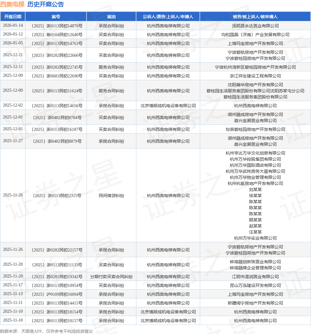 案号:(2025)浙0113民初11624号根据统计,近一年内以杭州西奥电梯有限公司为当事人的历史开庭公告有172则,其中案由为“买卖合同纠纷”的公告以75则居首,其次为“承揽合同纠纷”有57则,“合同纠纷”有12则。历史开庭公告(前20条)如下: