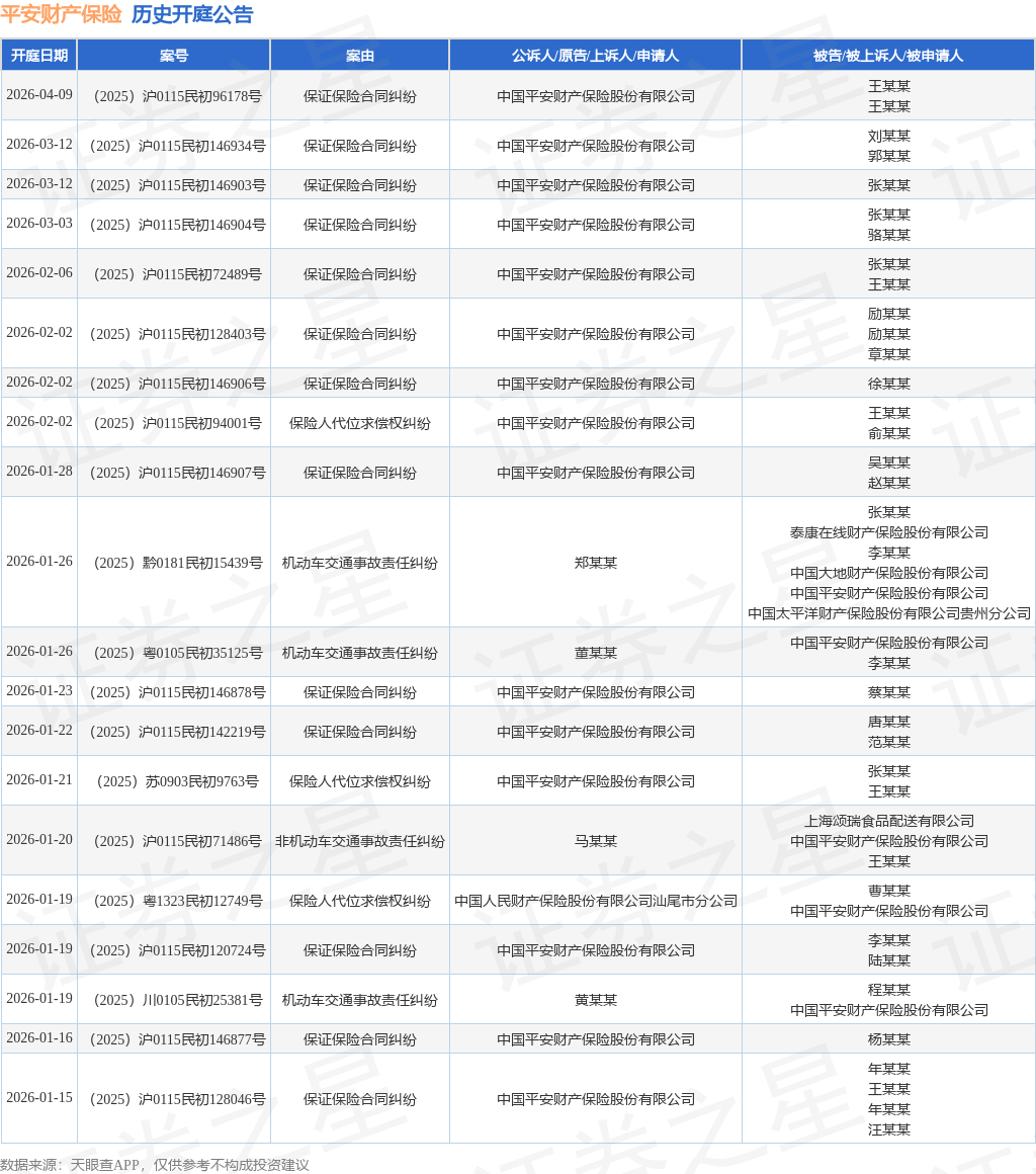 案号:(2025)沪0106民初40016号根据统计,近一年内以中国平安财产保险股份有限公司为当事人的历史开庭公告有2153则,其中案由为“机动车交通事故责任纠纷”的公告以1038则居首,其次为“保证保险合同纠纷”有281则,“保险人代位求偿权纠纷”有179则。历史开庭公告(前20条)如下: