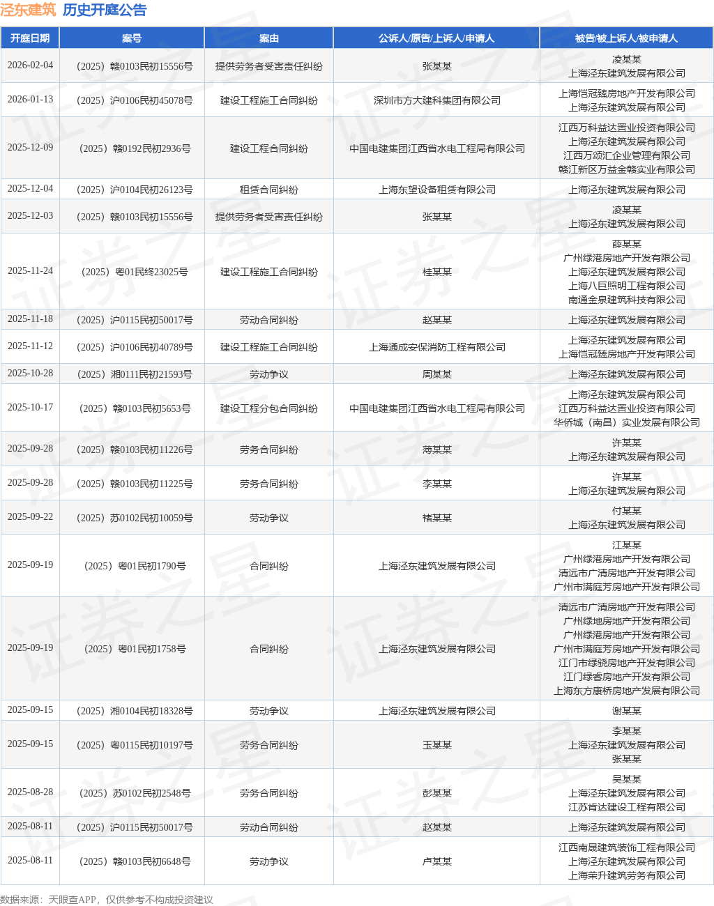 案号:(2025)赣0192民初2936号根据统计,近一年内以上海泾东建筑发展有限公司为当事人的历史开庭公告有97则,其中案由为“建设工程分包合同纠纷”的公告以18则居首,其次为“买卖合同纠纷”有17则,“劳务合同纠纷”有15则。历史开庭公告(前20条)如下: