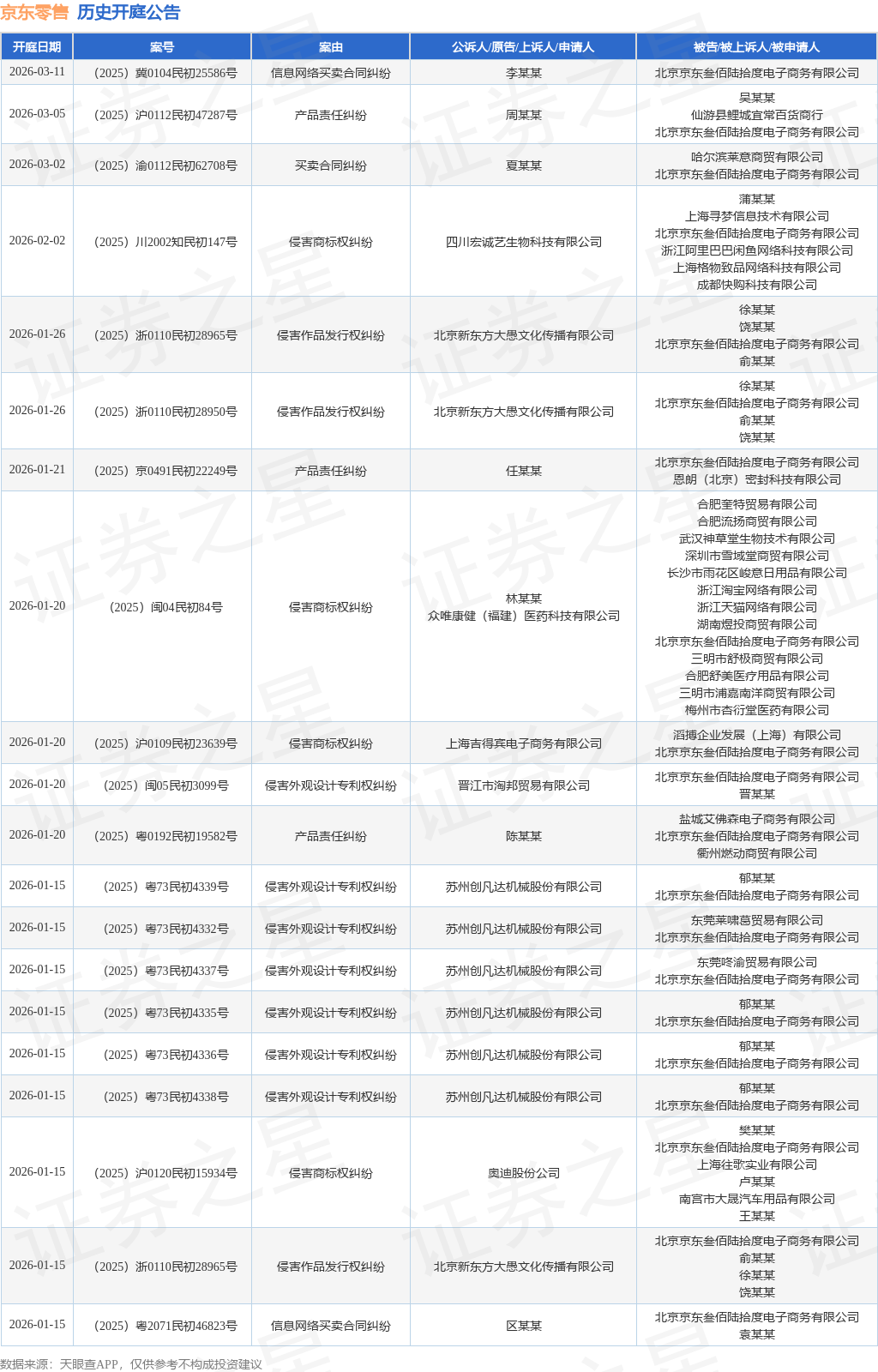 案号:(2025)京0102民初19982号根据统计,近一年内以北京京东叁佰陆拾度电子商务有限公司为当事人的历史开庭公告有1451则,其中案由为“侵害商标权纠纷”的公告以372则居首,其次为“信息网络买卖合同纠纷”有267则,“侵害外观设计专利权纠纷”有170则。历史开庭公告(前20条)如下: