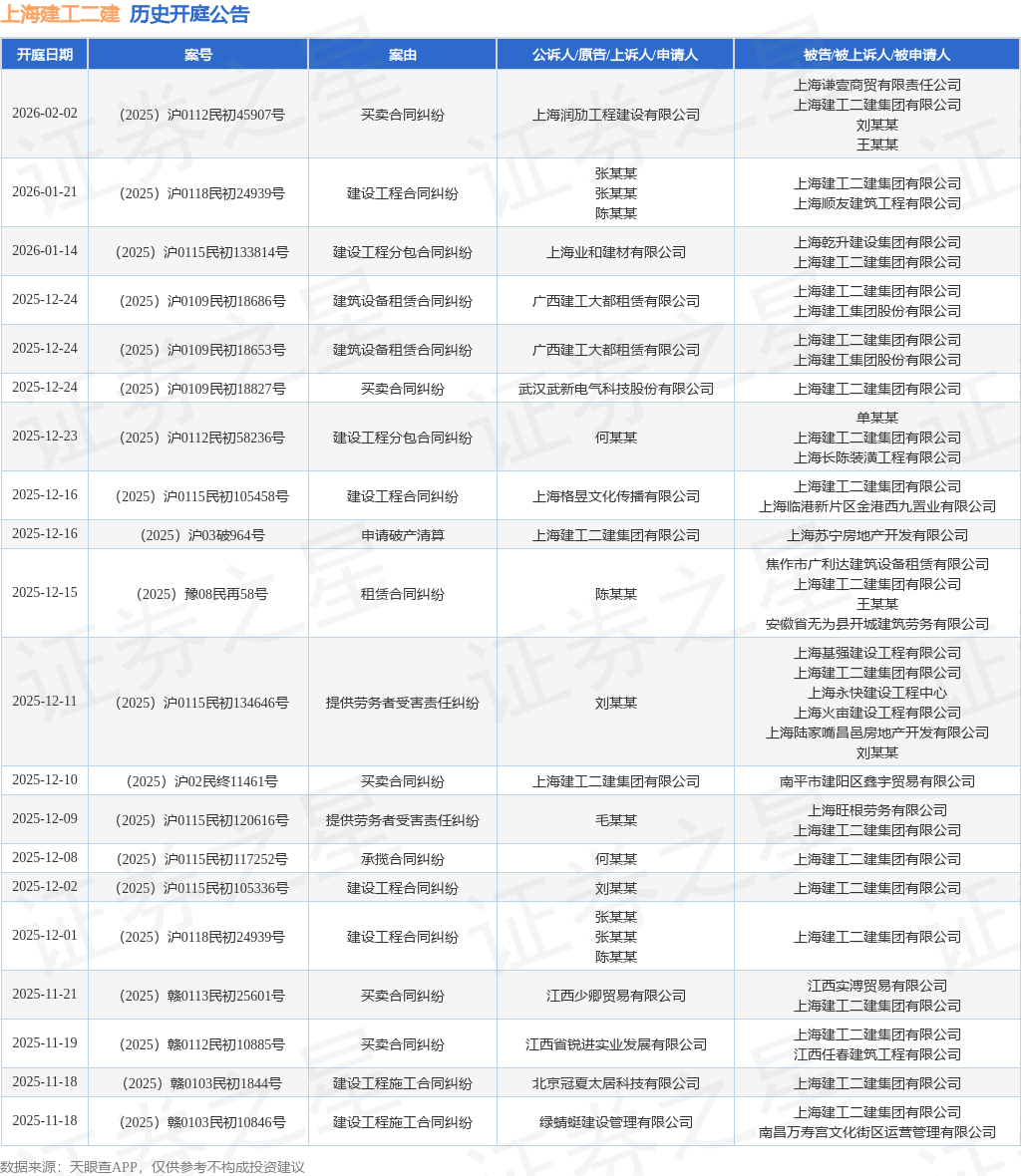 案号:(2025)沪0115民初120616号根据统计,近一年内以上海建工二建集团有限公司为当事人的历史开庭公告有258则,其中案由为“建设工程施工合同纠纷”的公告以67则居首,其次为“买卖合同纠纷”有30则,“建设工程分包合同纠纷”有27则。历史开庭公告(前20条)如下: