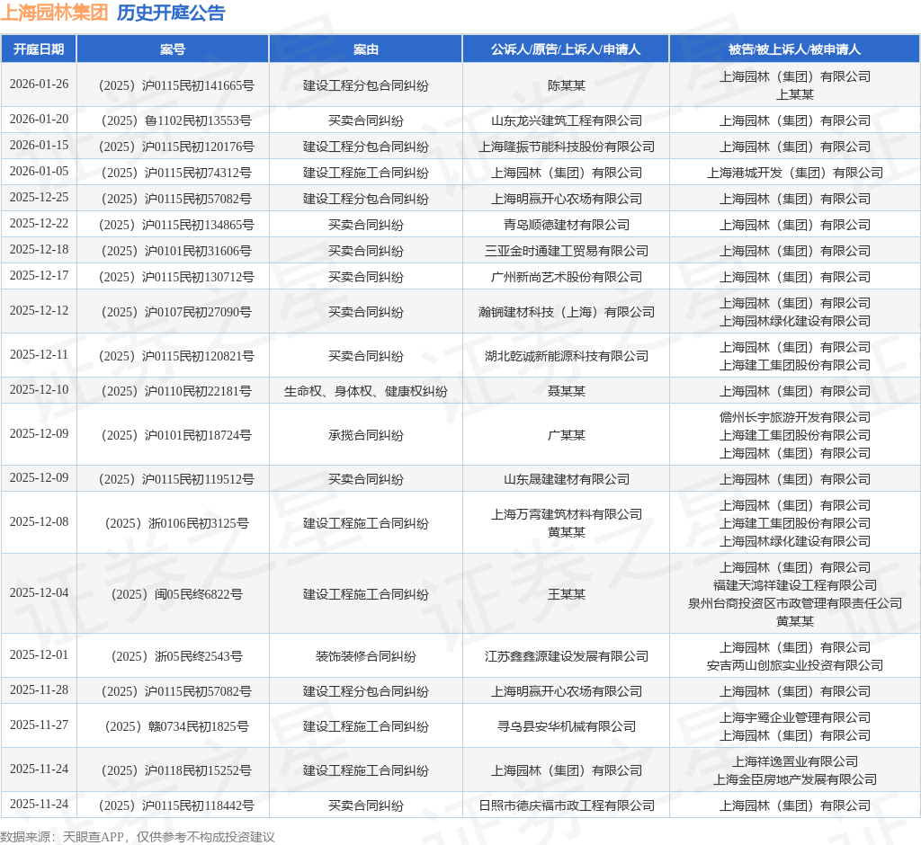 案号:(2025)沪0101民初18724号根据统计,近一年内以上海园林(集团)有限公司为当事人的历史开庭公告有78则,其中案由为“建设工程施工合同纠纷”的公告以21则居首,其次为“买卖合同纠纷”有20则,“建设工程分包合同纠纷”有8则。历史开庭公告(前20条)如下: