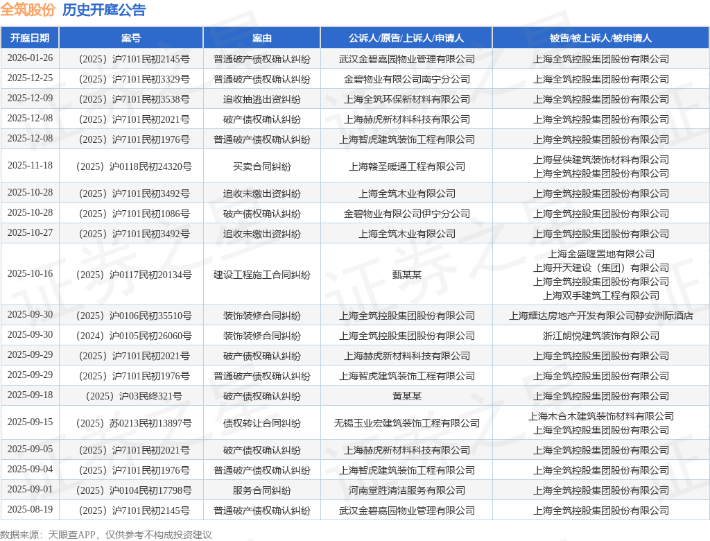案号:(2025)沪7101民初3538号根据统计,近一年内以上海全筑控股集团股份有限公司为当事人的历史开庭公告有86则,其中案由为“破产债权确认纠纷”的公告以19则居首,其次为“装饰装修合同纠纷”有15则,“建设工程施工合同纠纷”有13则。历史开庭公告(前20条)如下: