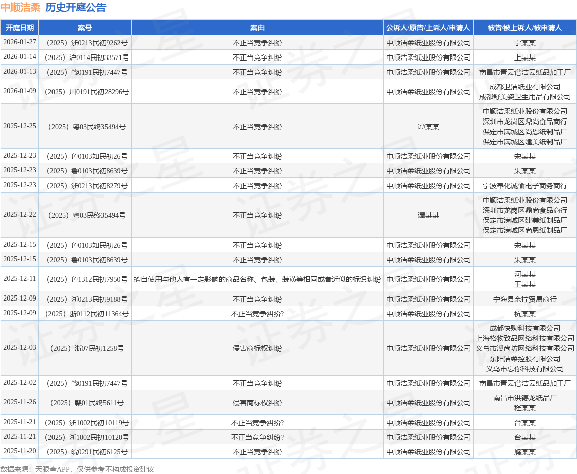 案号:(2025)浙0213民初9188号根据统计,近一年内以中顺洁柔纸业股份有限公司为当事人的历史开庭公告有297则,其中案由为“不正当竞争纠纷”的公告以218则居首,其次为“侵害商标权纠纷”有32则,“擅自使用与他人有一定影响的商品名称、包装、装潢等相同或者近似的标识纠纷”有26则。历史开庭公告(前20条)如下: