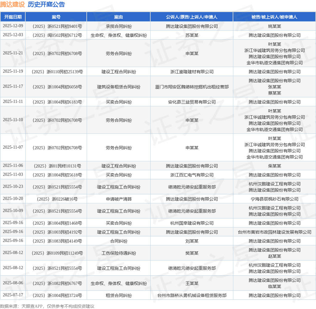 案号:(2025)浙0521民初9401号根据统计,近一年内以腾达建设集团股份有限公司为当事人的历史开庭公告有51则,其中案由为“买卖合同纠纷”的公告以10则居首,其次为“建设工程合同纠纷”有10则,“承揽合同纠纷”有9则。历史开庭公告(前20条)如下: