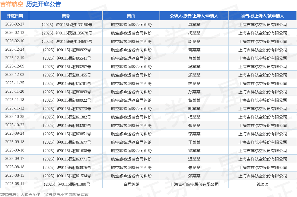 案号:(2025)沪0115民初93257号根据统计,近一年内以上海吉祥航空股份有限公司为当事人的历史开庭公告有54则,其中案由为“航空旅客运输合同纠纷”的公告以32则居首,其次为“劳动合同纠纷”有8则,“教育培训合同纠纷”有6则。历史开庭公告(前20条)如下: