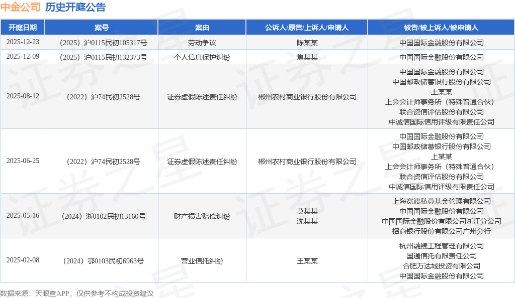 案号:(2025)沪0115民初132373号根据统计,近一年内以中国国际金融股份有限公司为当事人的历史开庭公告有6则,其中案由为“证券虚假陈述责任纠纷”的公告以2则居首,其次为“个人信息保护纠纷”有1则,“劳动争议”有1则。历史开庭公告如下: