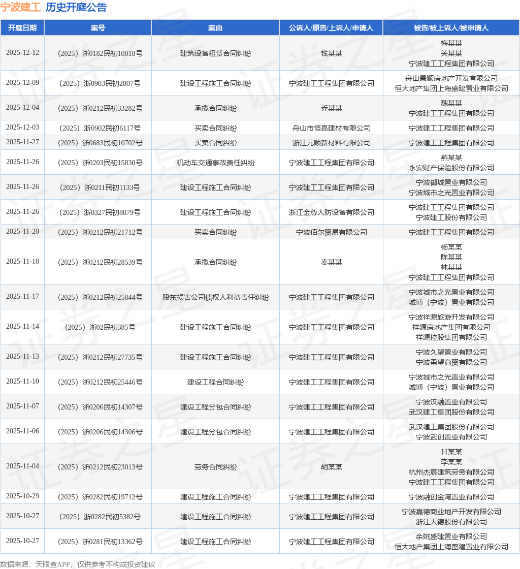 案号:(2025)浙0903民初2807号根据统计,近一年内以宁波建工工程集团有限公司为当事人的历史开庭公告有131则,其中案由为“建设工程施工合同纠纷”的公告以34则居首,其次为“买卖合同纠纷”有29则,“建设工程合同纠纷”有18则。历史开庭公告(前20条)如下: