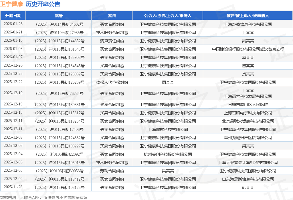 案号:(2025)沪0115民初124332号根据统计,近一年内以卫宁健康科技集团股份有限公司为当事人的历史开庭公告有88则,其中案由为“买卖合同纠纷”的公告以50则居首,其次为“劳动合同纠纷”有13则,“技术服务合同纠纷”有6则。历史开庭公告(前20条)如下: