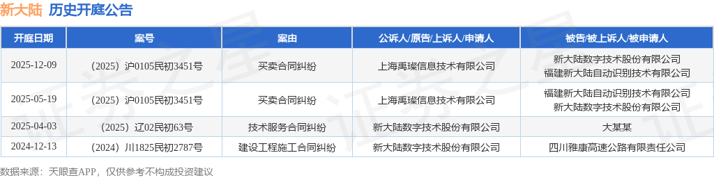 案号:(2025)沪0105民初3451号根据统计,近一年内以新大陆数字技术股份有限公司为当事人的历史开庭公告有4则,其中案由为“买卖合同纠纷”的公告以2则居首,其次为“建设工程施工合同纠纷”有1则,“技术服务合同纠纷”有1则。历史开庭公告如下: