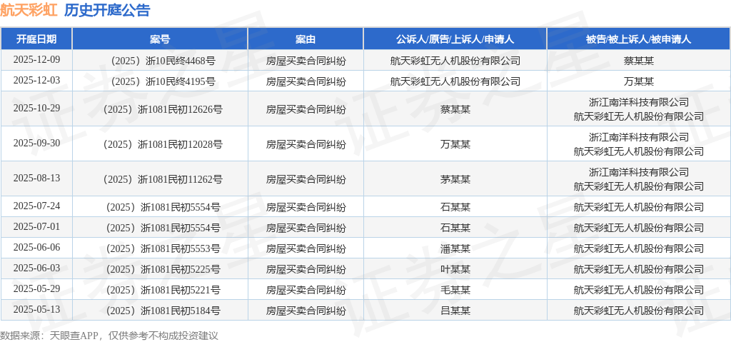 根据统计,近一年内以航天彩虹无人机股份有限公司为当事人的历史开庭公告有11则,其中案由为“房屋买卖合同纠纷”的公告以11则居首。历史开庭公告如下: