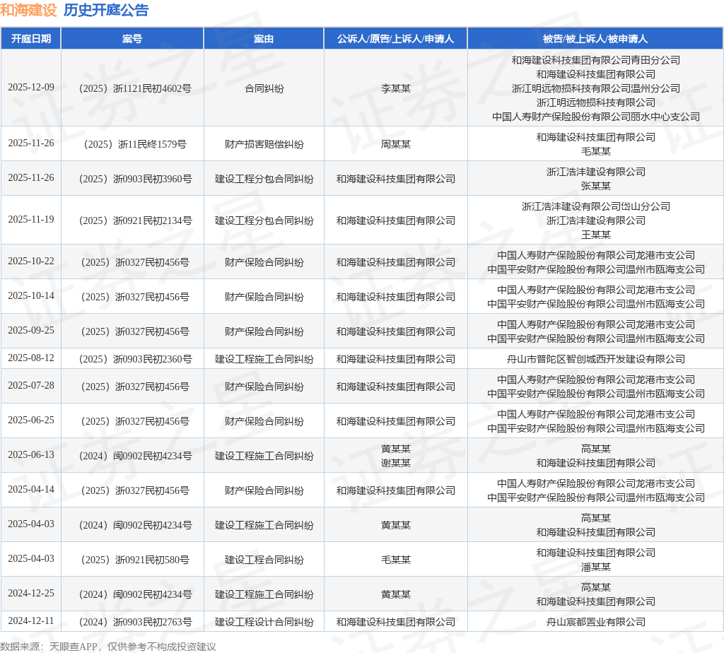 案号:(2025)浙1121民初4602号根据统计,近一年内以和海建设科技集团有限公司为当事人的历史开庭公告有16则,其中案由为“财产保险合同纠纷”的公告以6则居首,其次为“建设工程施工合同纠纷”有4则,“建设工程分包合同纠纷”有2则。历史开庭公告如下: