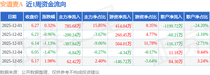 资金流向数据方面,本周安道麦A主力资金合计净流入253.18万元,游资资金合计净流入1027.43万元,散户资金合计净流出1280.62万元。本周资金流向一览见下表: