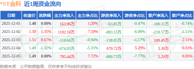资金流向数据方面,本周*ST金科主力资金合计净流入1276.87万元,游资资金合计净流出1216.23万元,散户资金合计净流出60.64万元。本周资金流向一览见下表: