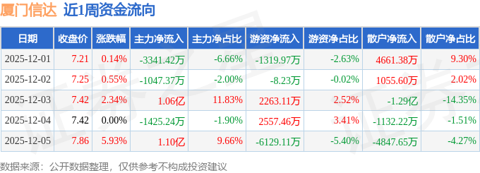 资金流向数据方面,本周厦门信达主力资金合计净流入1.58亿元,游资资金合计净流出2636.74万元,散户资金合计净流出1.32亿元。本周资金流向一览见下表: