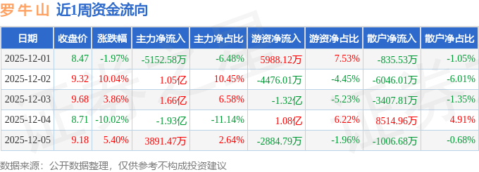 资金流向数据方面,本周罗 牛 山主力资金合计净流入6561.02万元,游资资金合计净流出3779.96万元,散户资金合计净流出2781.07万元。本周资金流向一览见下表: