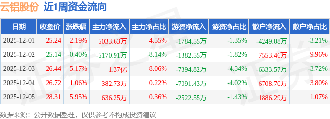 沪深股通持股方面,截止2025年12月5日收盘,云铝股份深股通持股数为1.92亿股,占流通股比为554.0%。