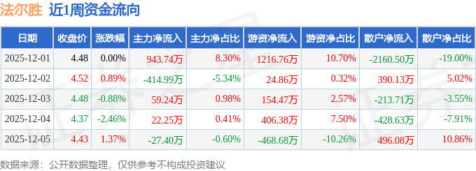 资金流向数据方面,本周法尔胜主力资金合计净流入582.84万元,游资资金合计净流入1333.79万元,散户资金合计净流出1916.63万元。本周资金流向一览见下表: