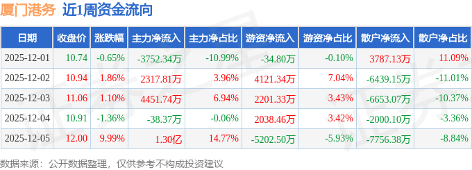资金流向数据方面,本周厦门港务主力资金合计净流入1.59亿元,游资资金合计净流入3123.84万元,散户资金合计净流出1.91亿元。本周资金流向一览见下表: