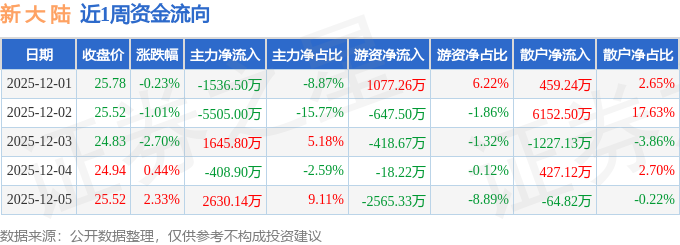 资金流向数据方面,本周新 大 陆主力资金合计净流出3174.46万元,游资资金合计净流出2572.45万元,散户资金合计净流入5746.91万元。本周资金流向一览见下表: