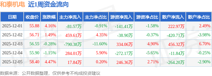 资金流向数据方面,本周和泰机电主力资金合计净流出110.49万元,游资资金合计净流入127.95万元,散户资金合计净流出17.46万元。本周资金流向一览见下表: