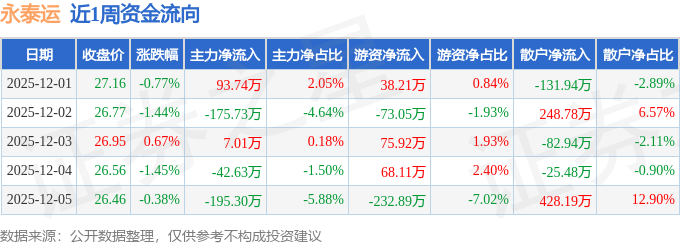 资金流向数据方面,本周永泰运主力资金合计净流出312.91万元,游资资金合计净流出123.71万元,散户资金合计净流入436.62万元。本周资金流向一览见下表: