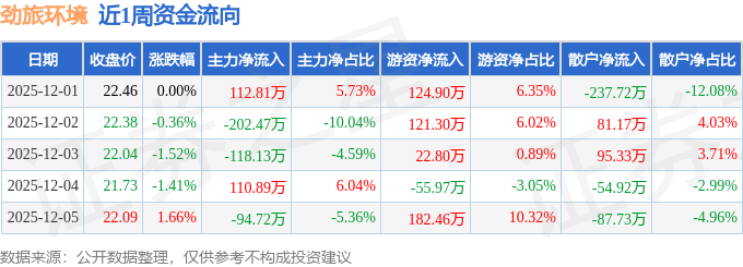 资金流向数据方面,本周劲旅环境主力资金合计净流出191.62万元,游资资金合计净流入395.48万元,散户资金合计净流出203.86万元。本周资金流向一览见下表: