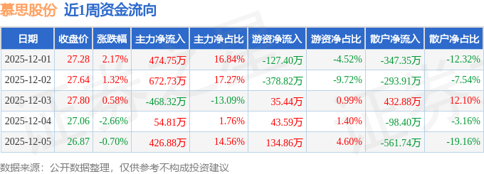 资金流向数据方面,本周慕思股份主力资金合计净流入1160.85万元,游资资金合计净流出292.33万元,散户资金合计净流出868.52万元。本周资金流向一览见下表: