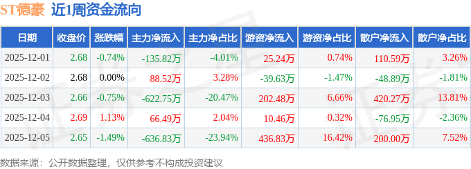 资金流向数据方面,本周ST德豪主力资金合计净流出1240.39万元,游资资金合计净流入635.38万元,散户资金合计净流入605.01万元。本周资金流向一览见下表:
